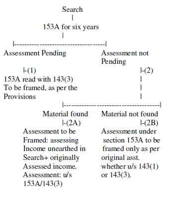 "4.1 On going through the provisions of section 153A, 2nd proviso and the various decisions cited before us, three possible circumstances emerge on the date of initiation of search u/s 132 (1) of the Income Tax Act, (a) proceedings are pending; (b) proceedings are not pending but some incriminating material found in the course of search, indicating some income and/or assets not disclosed in the return and (c) proceedings are not pending and no incriminating material has been found.4.2 When we treat to trace the correct and logical answers to the above circumstances, circumstances (a) is answered by the Act itself, that is, since the proceedings are still pending, all those pending proceedings are abated and the Assessing Officer gets a free hand to make the assessment. Circumstances (b) has been answered by the courts, interpreting 2nd proviso along with clause (b) to section 153A, wherein the Hon'ble Delhi High Court observes and hold, "where the assessment or reassessment proceedings have already been completed and assessment orders have been passed determining the assessee's total income and such orders are subsisting at the time when the search or the requisition is made, there is no question of any abatement since no proceedings are pending. In this latter situation, the Assessing Officer will reopen the assessments or reassessments already made (Without having the need to follow the strict provisions or complying with the strict conditions of section 147, 148 and 151) and determine the total income of the assessee. Such determination in the orders passed u/s 153A would be similar to the orders passed in any reassessment, where the total income determined in the original assessment order and the income that escaped assessment are clubbed together and assessed as the total income. But when we come to third circumstance i.e. circumstance (c), we find that this has been left unanswered. Para 23 of the judgment, the Hon'ble Delhi High Court mentions that the issue is left open.4.3 This, has been explained in the graphic made below and the relevant portion is in italics therein. This can be explained through this graphic:4.4 To answer the question, as to what shall be the assessment of total income, where there is/ are no pending proceedings and no incriminating material, we have to trace out the logical conclusion, by harmonizing the legislative intendments and the judicial decisions, as held by the Hon'ble Supreme Court of India in the case of K P Verghese (Supra), wherein it was observed, so as to achieve the obvious intention of the Legislature and produce a rational construction. When we look into the decision of the Hon'ble Delhi High Court in Anil Kumar Bhatia (Supra), we find that the Hon'ble Court has pointed out that in case where there is no abatement, total income has to be determined by clubbing together the income already determined in the original assessment order and the income that escaped assessment (Situation 2A in the Graphic). In the circumstance, what we are dealing in instantly, there are finalized assessment proceedings and no incriminating material indicating any escaped income (Situation 2B in the graphic). Taking a cue from the decision of Hon'ble Delhi High Court in the case of Anil Kumar Bhatia (Supra) we can tread on the same premise and hold that on clubbing, what remains in the income originally determined or assessed (i.e. income originally determined+Zero= income originally determined- as there was no incriminating material)."